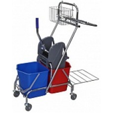 Двойная уборочная тележка, 34л (2*17л). Габариты: 1185×400×1005 мм. Материал - хромированная сталь, пластиковые ведка по 17л для чистой и грязной воды, универсальный отжим, сетка и держатель для мусорного мешка на 120л. Тележка имеет перекидную ручку для удобства перемещения без разворота самой тележки.
